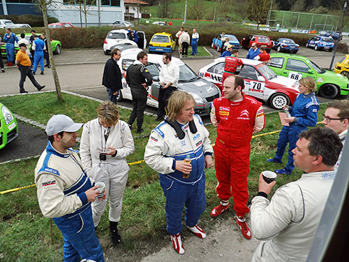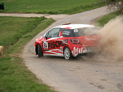 So richtig hellwach dürften auch Sascha Kirchmer / Alexa Brunken nicht gewesen sein – glaubt man, wenn man die Zeiten sieht. Korrekt war jedoch, dass sich die beiden Pfälzer bei der Reifenwahl voll verpeilt hatten. Sie hatten auf weichen Gummi und nasse Fahrbahn gesetzt und entsprechende Rundlinge an ihrem Citroen DS3 montiert. Nur leider konnten die sehr zahlreichen Zuschauer die Schirme geschlossen halten. Für die Zuschauer war das ja toll mit der vielen Sonne, nur für das Pfälzer Team nicht. Tatsächlich fiel kein Tropfen Regen und die Reifen verrauchten ungekühlt – Platz 5.