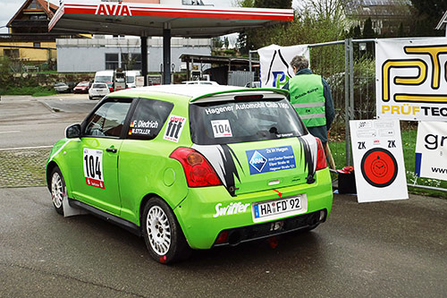 Nur am Start von WP 5 verging den beiden dann doch etwas die Freude. Peng . Und der Suzuki blieb stehen. Ein technisch bedingter Ausfall.