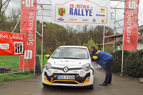 Eigentlich wollten Doppelsieger Timo Wadle / Tobias Schäfer auch wieder ein Wörtchen um den Sieg mitreden. Aber schon auf dem Rundkurs WP2 sahen sie den Twingo von Kazmierzak/ Vogel im Rückspiegel näher kommen. 46 Sekunden Zeitverlust! Also wurden die „kriegerischen Handlungen” komplett eingestellt und etwas vorsichtiger das Ziel angesteuert. Die Führung in der Trophy blieb so locker bei ihnen.