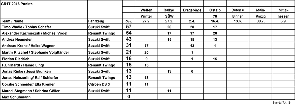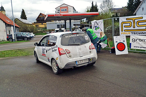 Auf WP 1 ging es dann gleich richtig zur Sache. Alexander Kazmierzak / Michael Vogel pfefferten eine 37. Gesamtzeit in den Zeitenrechner. Dabei ließen sie die (nicht in der GR1-Trophy eingeschriebenen) Tobias Just / Marc Buhmann um lächerliche 0,3 Sekunden hinter sich. Das ging dann zwischen den beiden Teams immer hin und her. Auf der WP 2 war dann der DS 3 um 12,5 Sekunden schneller auf WP 3 dann wieder der Twingo um 0,3 Sekunden. Vor der 6. und letzten WP trennten die beiden Streithähne noch 2,3 Sekunden, als Tobias Just dem Twingo-Team 28,9 Sekunden auf’s Auge drückte. Das war's dann. Verdienter Klassensieg für Just / Buhmann, aber volle Punkte in der Germanys-R1-Trophy 2016 für Alexander und Michael.