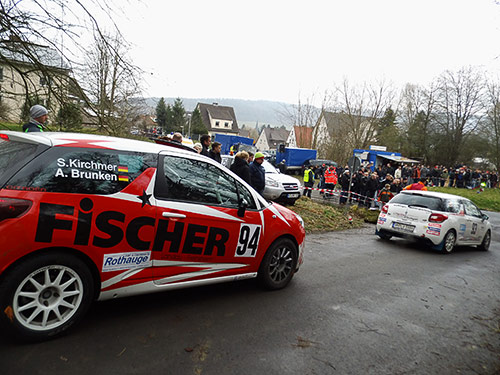 hintereinander: Also Timo Wadle / Tobias Schäfer (Suzuki Swift) ganze 0,7 sec vor Sascha Kirschmer / Alexa Brunken (Citroen DS3) und diese wiederum 2,8 sec vor dem Suzuki Swift von Florian Diedrich / Kirsten Hasenpusch. Enge Kiste also.
