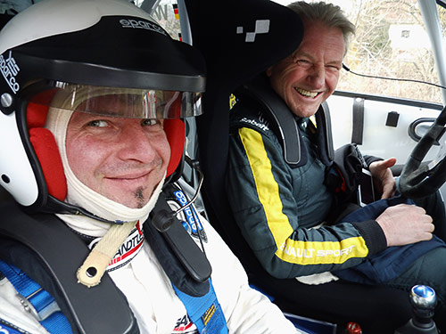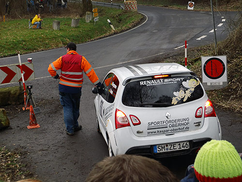 Ein wildes Auf und Ab legte Trophy-Neuzugang Willi Wiegmann mit seinem Co Birger Triebel auf die teils glatte Piste. Eine sehr deutliche Bestzeit auf der letzten richtig glatten WP 6 zementierte Platz 3 auf dem Treppchen. Immerhin konnten wir ihm ein „... hat jede Menge Spaß gemacht. Hätte ich nicht gedacht ...” entlocken. Willi wollte eigentlich nur noch in Autos mit über 200 PS einsteigen. Der Twingo RS von der Sportförderung Oberhof hat nur ca. 140 PS. Wir alle hoffen, dass er trotzdem wiederkommt und weitere Rallyes in der R1-Trophy fährt .
