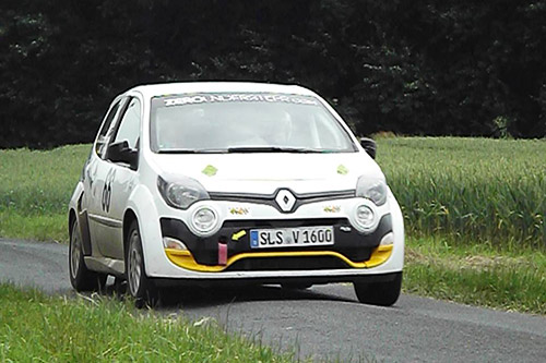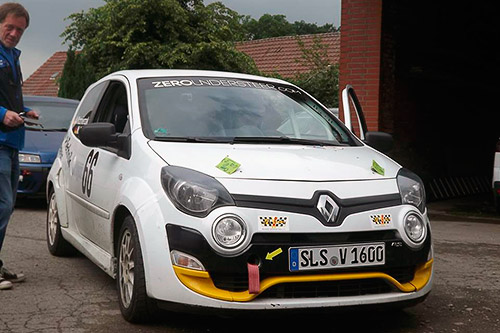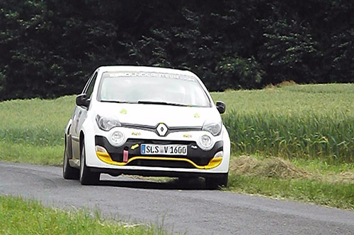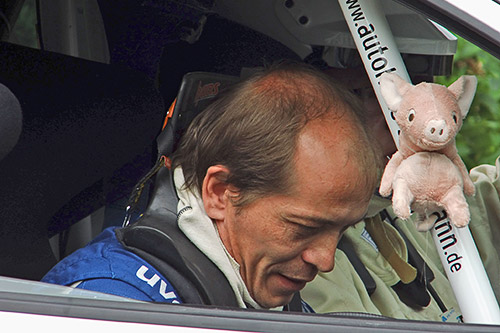 In der GR1-Trophy haben Alexander Kazmierzak / Michael Vogel (Twingo RS) mit (relativ) vorsichtiger Fahrt und „Schwein” im Auto – siehe Foto – die ihnen unbekannten Prüfungen des IVG-Geländes ge- meistert. Ihr zweiter Platz brachte in der Trophy 17 Punkte. Mit 71 Punkten bedeutet das nun die Führung in der Trophy. Wadle / Schäfer folgen mit unveränderten 57 Punkten.