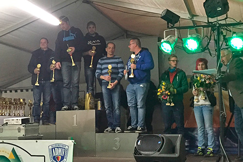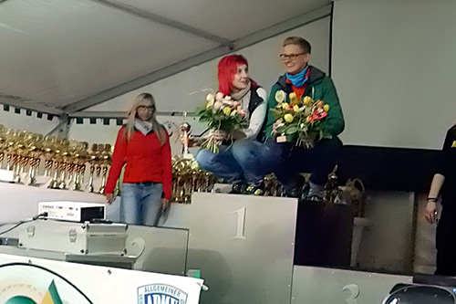 Die (fast) pünktliche Siegerehrung beginnt und Andrea Neumeier und Sara Phieler dürfen das „Treppchen” erklimmen. Das war schon eine richtig hohe Treppe mit etwa doppelter Stufenhöhe. Der spätere Gesamtsieger stieß mit seinem Kopf fast gegen das Zeltdachgestänge...