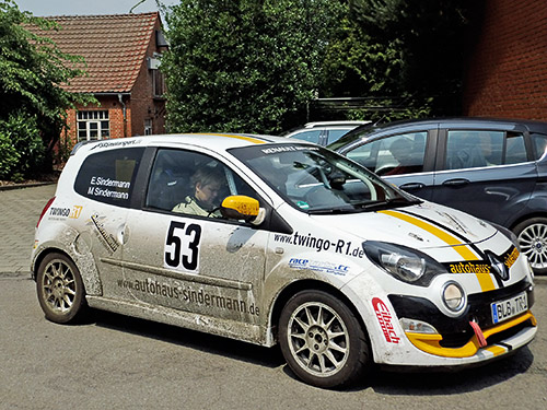 Dieser (halbe) Junior Philipp sah (leicht) rot, als er sah, dass der anerkannt schnelle Erik Sindermann mit Gattin Miriam seinen Twingo RS an den Start brachte. Immerhin hat der Renault-Händler in der Vergangenheit hier schon einen Gesamtsieg mit einem Renault 5 (!!) hingelegt und kannte sich besten im Gelände aus.